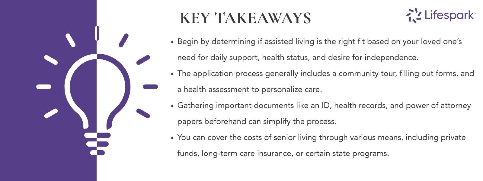 - Begin by determining if assisted living is the right fit based on your loved one’s need for daily support, health status, and desire for independence.
